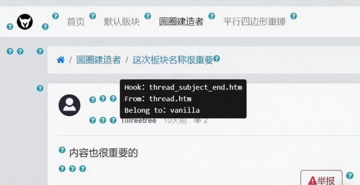 开发专用插件,将原版Xiuno BBS内置的前台Hook点显示出来,并附上对应的所在文件。